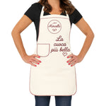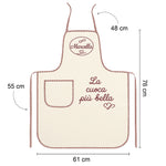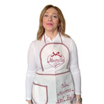 Il tessuto écru naturale si abbina con gusto ai dettagli rossi ricamati, mentre la possibilità di personalizzare il grembiule con un nome o una dedica lo rende unico e perfetto per occasioni speciali.